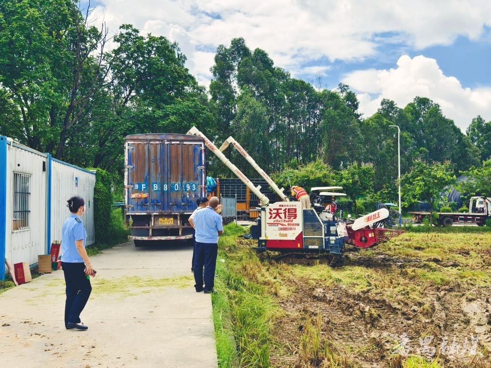 广州市祥隆农机专业合作社的负责人告诉记者,当天农机合作社的三台收割机一大早就来到了这里,等稻穗上的露水一干,收割机作业,几个小时就可以收割完毕。为确保农机安全作业,番禺区农机安全监督管理站的工作人员来到现场进行监管。